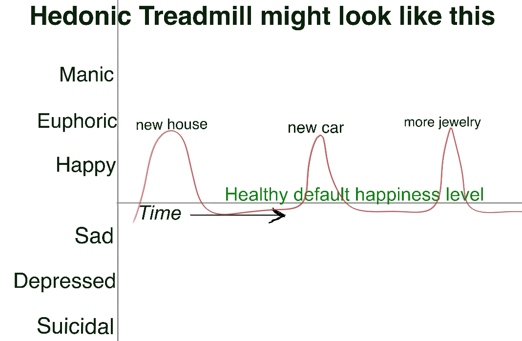 When we finally get that new house, car, motorcycle, boat, promotion, jewelry — whatever — we are happier….for a surprisingly short time. Then, inevitably, we drop back to our default happiness level. Every. Single. Time.