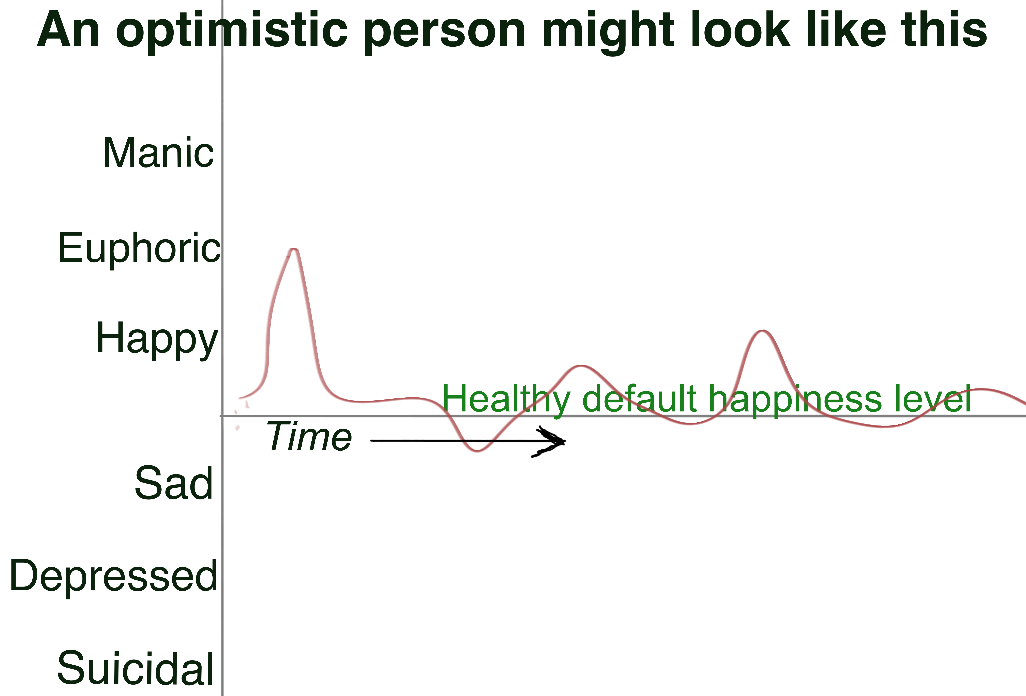 People who manage to consistently maintain healthy default happiness levels rarely get on the hedonic treadmill. But it’s important to note (as depicted in my crude ‘sine wave’ graph above) occasional periods of sadness are a natural and healthy part of even optimists’ lives…